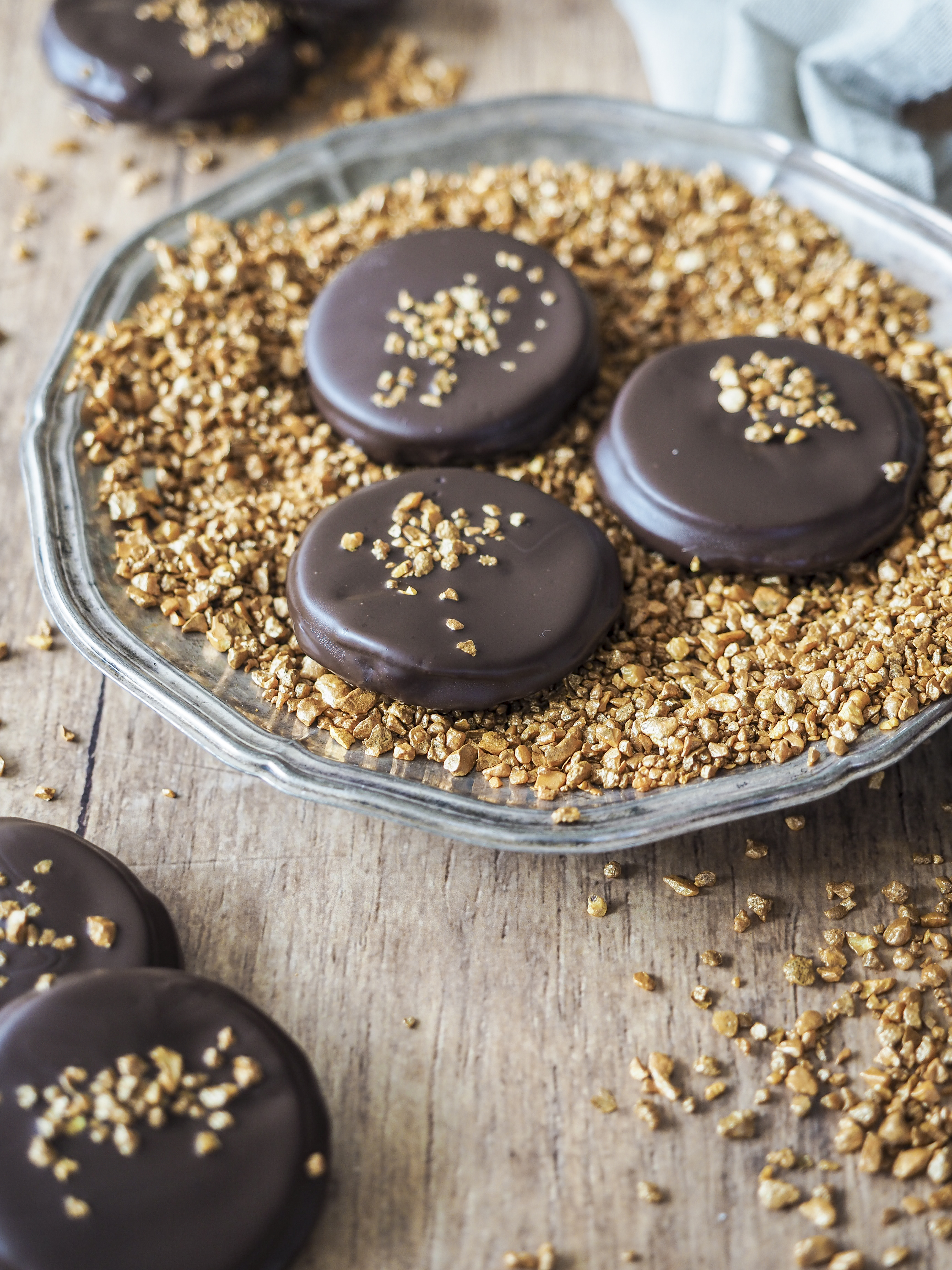 Die Kuvertüre zusammen mit dem Kokosfett über dem Wasserbad schmelzen, die Taler darin eintauchen und auf Backpapier absetzen. Eventuell umsetzen, sodass keine „Füsschen“ entstehen. Mit goldenen Streuseln verzieren und die Kuvertüre fest werden lassen. Wenn gewünscht, mit essbarem Goldpuder bepinseln.